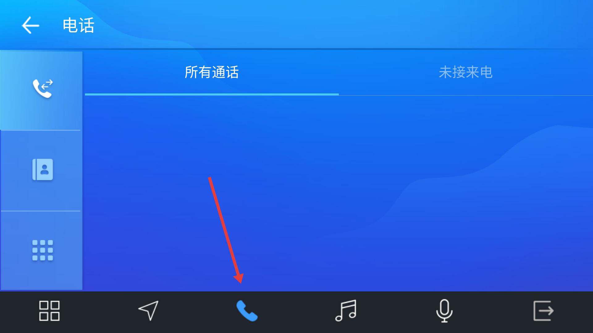 2、從主界面點電話圖標(biāo),進(jìn)入通話頁面,左側(cè)有通話、聯(lián)系人、撥號盤選項,底部電話圖標(biāo)可快速發(fā)起通話。