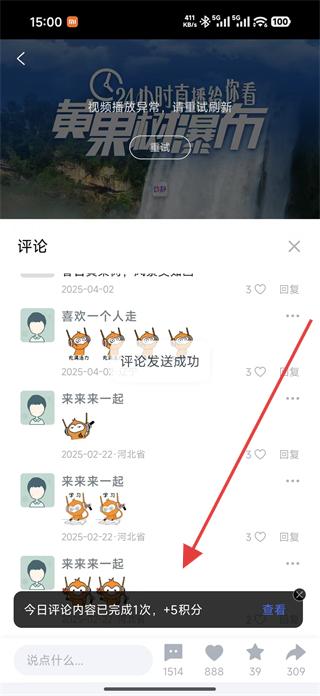 4、評(píng)論發(fā)送成功后可看到今日評(píng)論內(nèi)容已完成次數(shù)及積分獎(jiǎng)勵(lì)提示,了解自己的互動(dòng)成果。