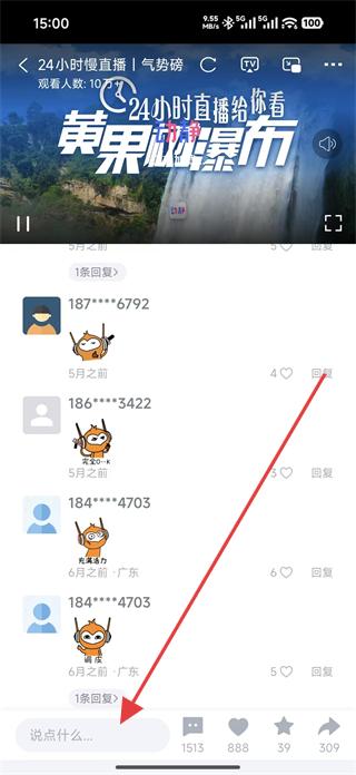 2、在直播觀看界面可看到直播的觀看人數(shù)等信息,點(diǎn)擊評(píng)論區(qū)的說(shuō)點(diǎn)什么,進(jìn)入評(píng)論輸入頁(yè)面。
