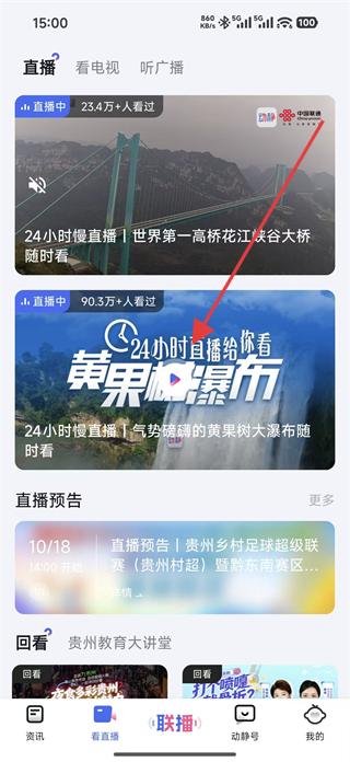 1、瀏覽直播內(nèi)容,選擇24小時(shí)慢直播氣勢(shì)磅礴的黃果樹(shù)大瀑布隨時(shí)看這一直播,點(diǎn)擊進(jìn)入直播觀看界面。