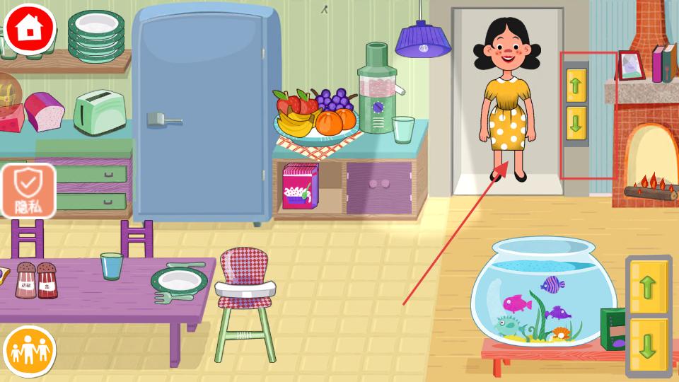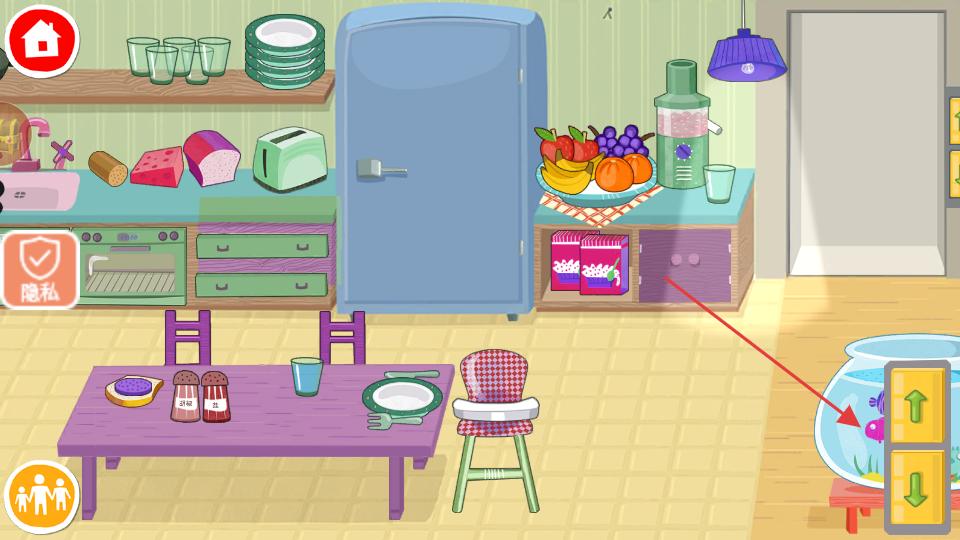 2、進入廚房后觀察冰箱、餐桌、櫥柜等擺放的物品,點擊右側(cè)魚缸附近的上下箭頭,調(diào)整互動元素或視角,進一步探索廚房內(nèi)的可互動點。