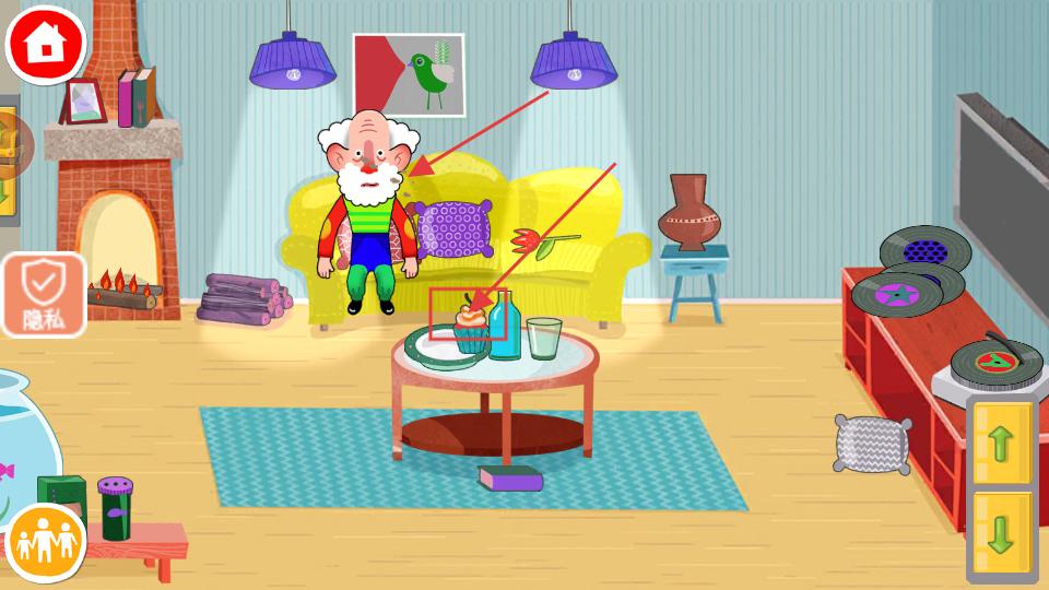 4、從廚房進入客廳看到沙發(fā)上的老人以及茶幾上的蛋糕、花瓶等物品,點擊這些物品或與老人進行互動,推進家庭小屋的探索劇情,解鎖更多房間或內(nèi)容。