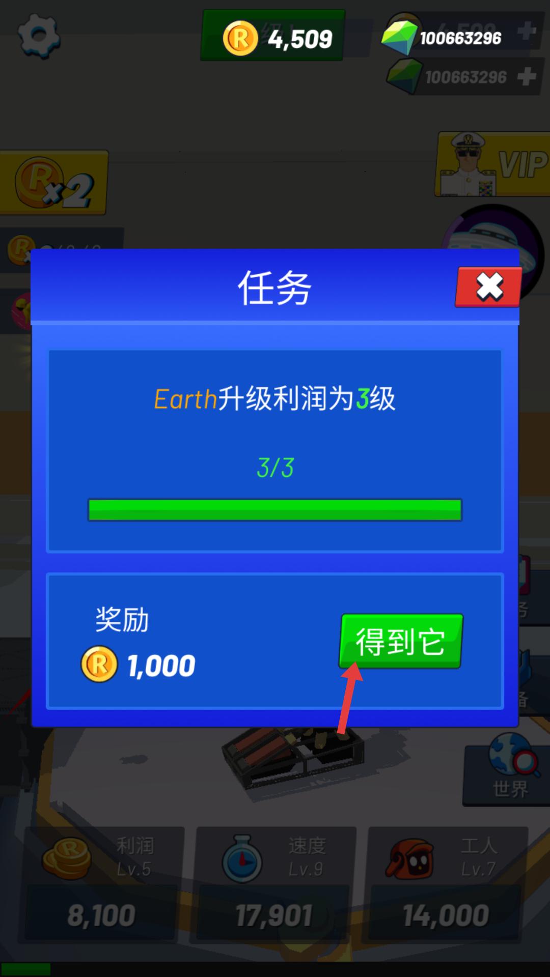3、完成任務后會彈出任務獎勵界面,界面有得到它按鈕,點擊可領取獎勵,獎勵能用于升級等操作,助力游戲進程。