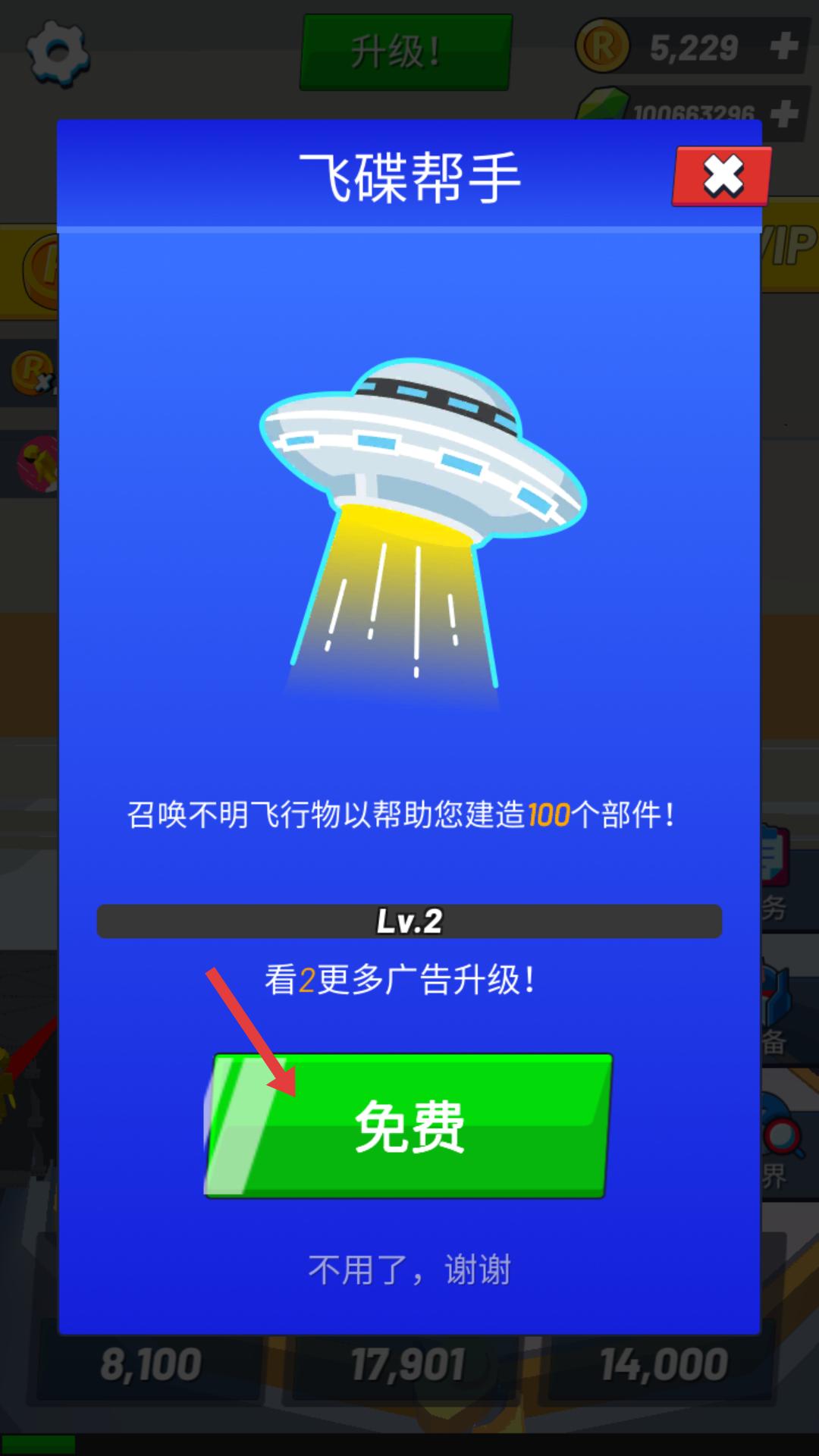 4、當出現(xiàn)飛碟幫手界面時,點擊免費按鈕,可召喚飛碟幫手,它能幫助建造部件,提升建造效率,推動游戲發(fā)展。
