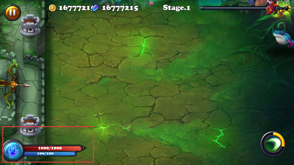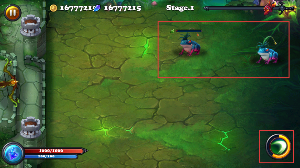 2、當(dāng)青蛙等敵人出現(xiàn)時(shí),點(diǎn)擊右側(cè)技能按鈕,釋放技能攻擊敵人,阻止它們靠近城堡。
