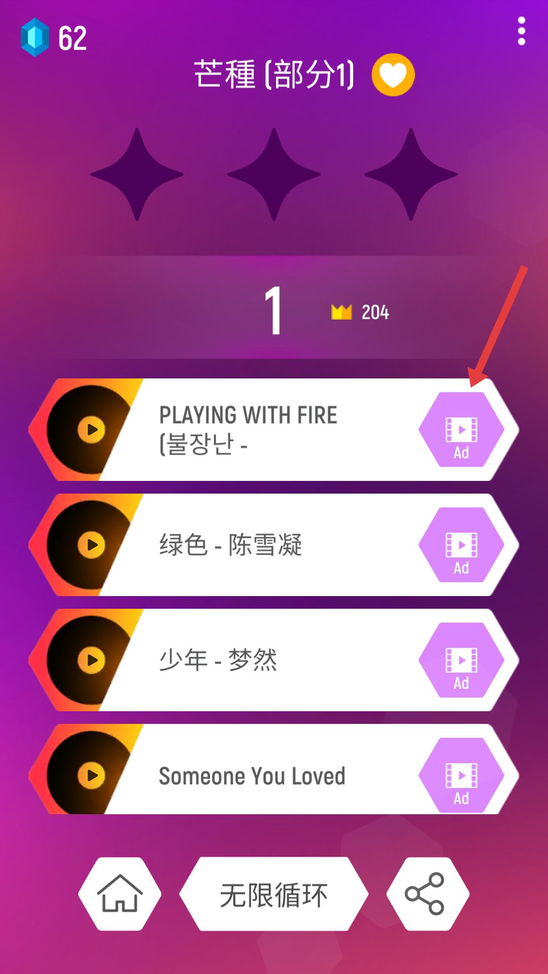 1、在歌曲選擇界面,若想解鎖新歌曲,可點擊歌曲右側(cè)帶有Ad標識的按鈕,觀看廣告后即可解鎖該歌曲,豐富游戲體驗。