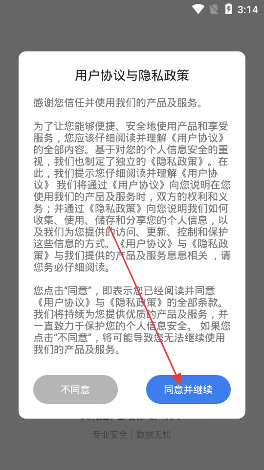 1、首次打開APP會彈出用戶協(xié)議及隱私政策界面,需仔細閱讀后點擊同意才能繼續(xù)使用APP,這一步是為了確保用戶了解并同意平臺使用個人信息的規(guī)則。
