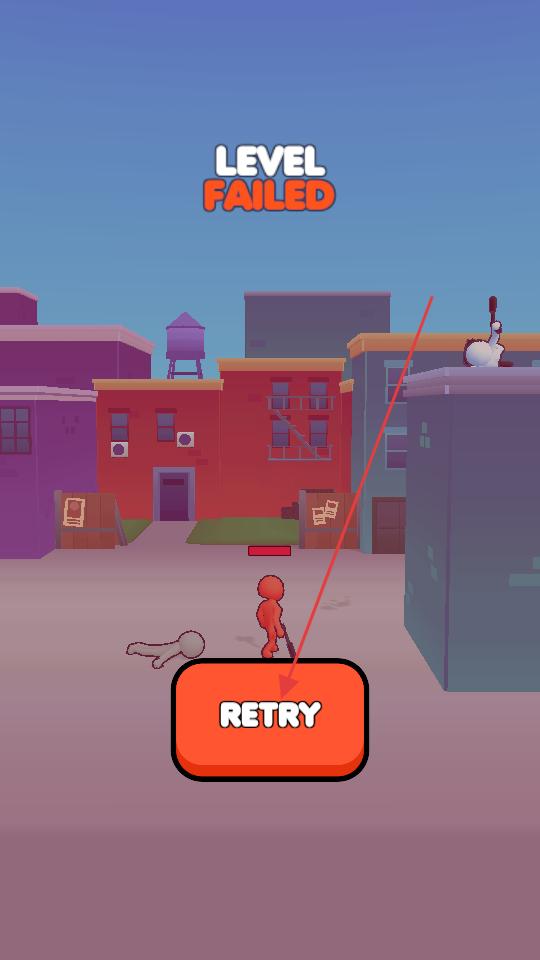 4、如果戰(zhàn)斗失敗畫(huà)面會(huì)顯示關(guān)卡失敗的提示,此時(shí)點(diǎn)擊橙色的重試按鈕,重新進(jìn)入第一關(guān),再次嘗試操控白色火柴人,擊敗紅色火柴人敵人,完成關(guān)卡挑戰(zhàn)。