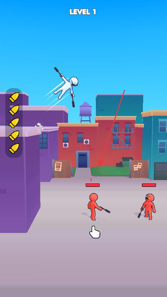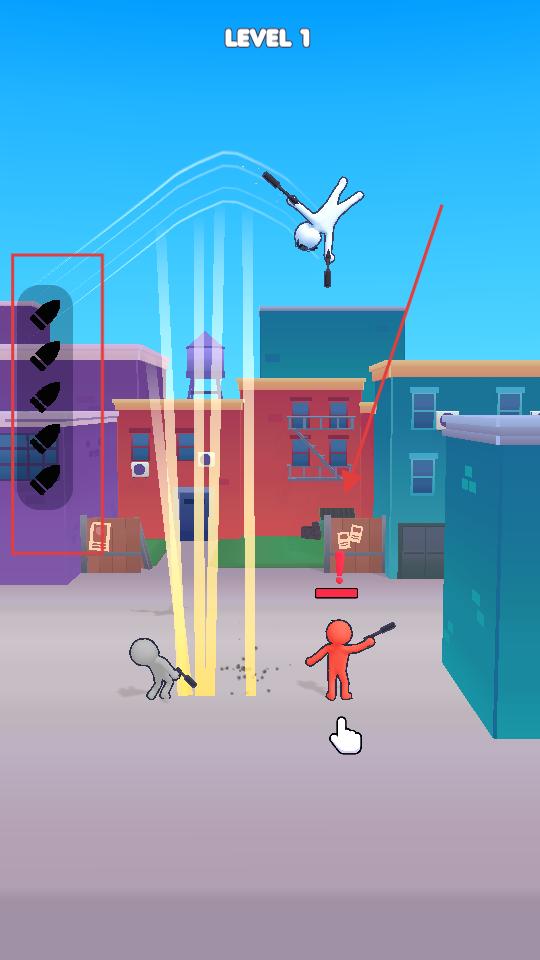 3、持續(xù)操控白色火柴人,調(diào)整射擊角度,發(fā)射更多子彈,盡可能消滅場(chǎng)景中的紅色火柴人敵人,注意左側(cè)子彈數(shù)量,合理利用子彈進(jìn)行攻擊。