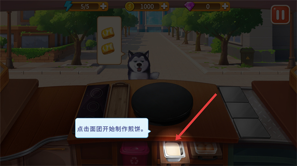 3、制作煎餅時(shí),點(diǎn)擊面團(tuán)開始制作,按照步驟操作,逐步完成煎餅的制作,滿足客人的需求。