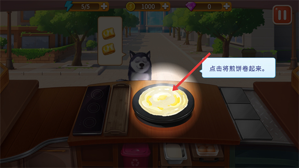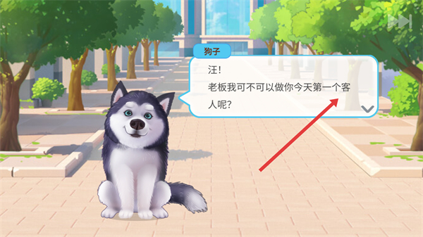 2、會(huì)有狗子來(lái)互動(dòng),詢問能否成為今天第一個(gè)客人,和狗子交流,開啟為它制作煎餅的流程。