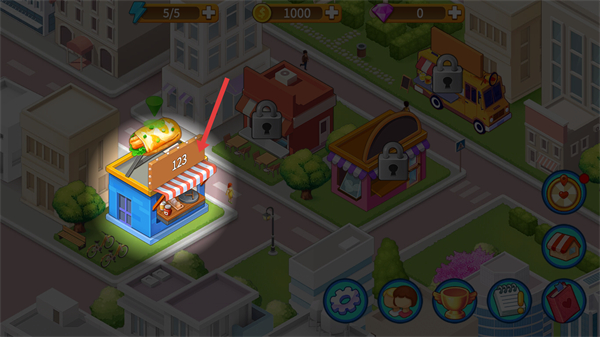 1、能看到城市場(chǎng)景里的店鋪,其中有可經(jīng)營(yíng)的煎餅店,開啟經(jīng)營(yíng)煎餅店的旅程,準(zhǔn)備迎接顧客。