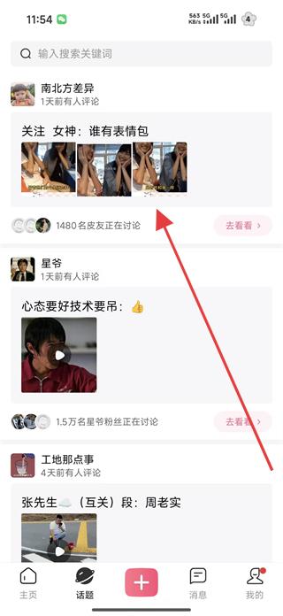 1、進(jìn)入話題頁(yè)面,能看到搜索關(guān)鍵詞欄,還有南北方差異等話題展示,以及關(guān)注的女神,誰(shuí)有表情包話題,點(diǎn)擊該話題查看相關(guān)內(nèi)容。