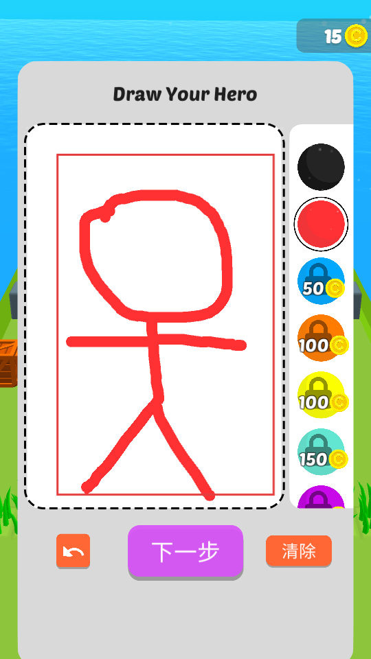1、點擊開始,進(jìn)入游戲,先在Draw Your Hero界面繪制自己的英雄形象,可選擇顏色,畫好后點擊下一步。