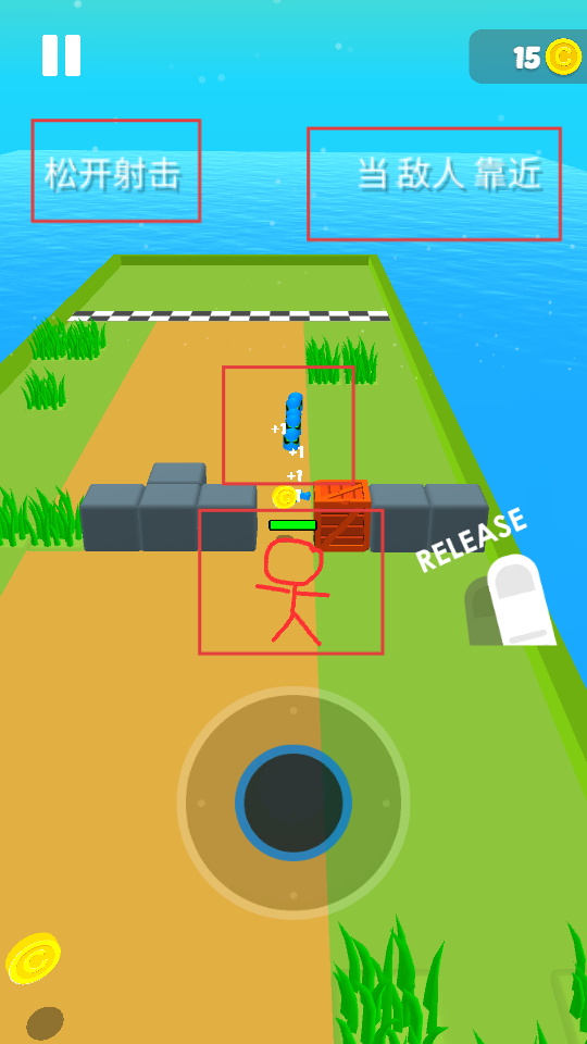 2、進(jìn)入關(guān)卡,操控繪制的英雄前進(jìn),路上有金幣和敵人,當(dāng)敵人靠近時,松開射擊,攻擊敵人,收集金幣。