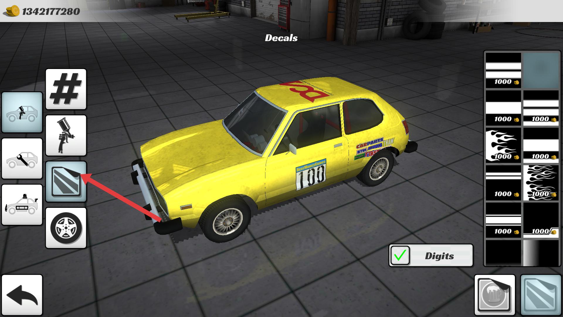 4、點(diǎn)擊左側(cè)貼紙圖標(biāo),進(jìn)入貼紙裝飾界面,右側(cè)有不同樣式貼紙,花費(fèi)1000金幣選擇喜歡的貼紙,為賽車增添獨(dú)特標(biāo)識,完成個(gè)性化改裝。