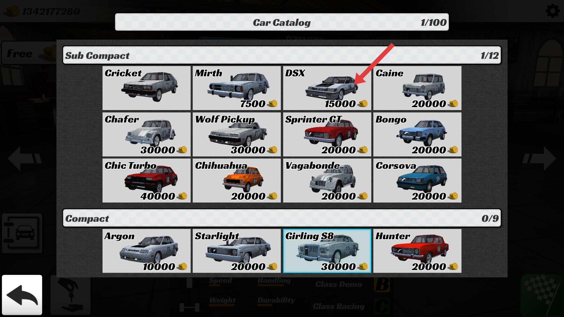2、有多種車型可選,如Sub Compact類的DSX等,根據(jù)金幣數(shù)量和車型屬性,選擇心儀賽車,點(diǎn)擊即可解鎖使用。