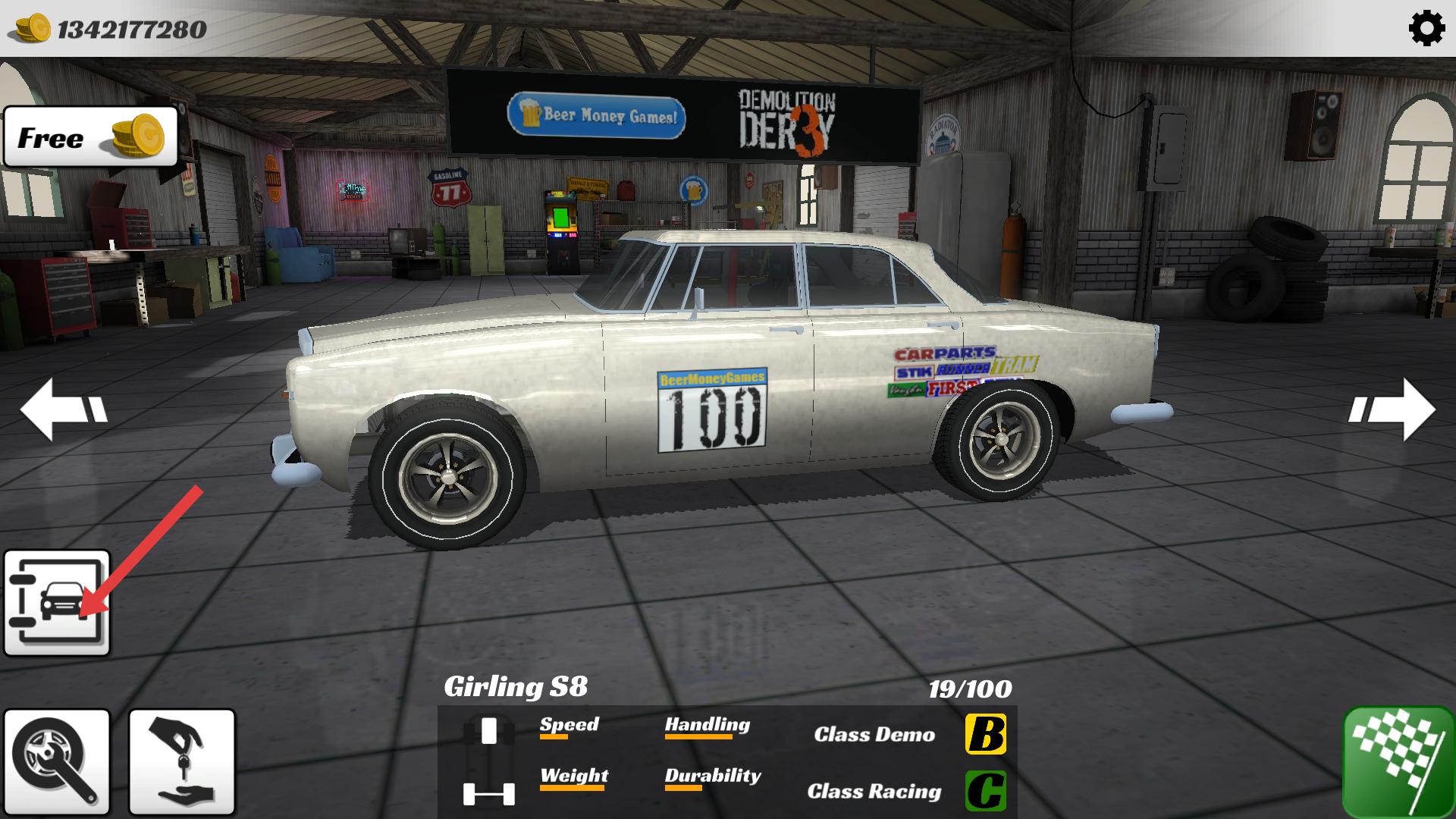 1、點(diǎn)擊左側(cè)帶汽車圖標(biāo)的按鈕,進(jìn)入車輛選擇界面,可查看不同車型,為后續(xù)挑選合適賽車參與demolition derby做準(zhǔn)備。