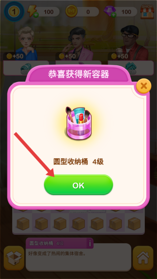 3、成功合并等操作后,會獲得新容器,如圓型收納桶4級,點擊OK確認,解鎖新的收納容器。