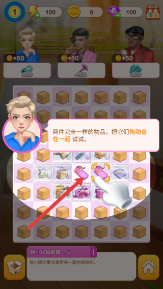 2、物品合并界面,將兩件完全一樣的物品拖動合并于一起,通過合并來獲取新的物品或推進游戲進程。