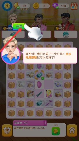 4、完成訂單后,界面會提示點擊完成按鈕交單,順利交付訂單可推進游戲,獲得相應的游戲反饋。