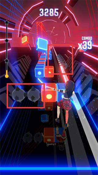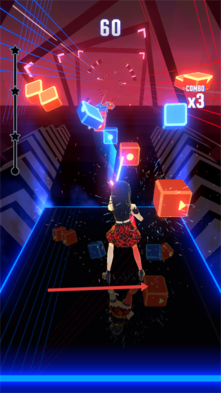 2、游戲過程中會(huì)有彩色方塊隨節(jié)奏出現(xiàn),要及時(shí)用武器切割方塊,切割時(shí)注意節(jié)奏,跟上音樂節(jié)拍左右移動(dòng),這樣能獲得更高分?jǐn)?shù),玩家還能觸發(fā)連擊。