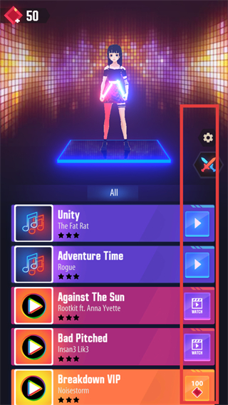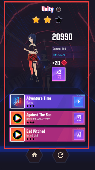 1、首先進(jìn)入選歌界面,可看到多首歌曲,像Unity、Adventure Time等,選歌時(shí)可根據(jù)歌曲星級(jí)和自己喜好來挑,選好后點(diǎn)擊右側(cè)播放按鈕開始游戲。