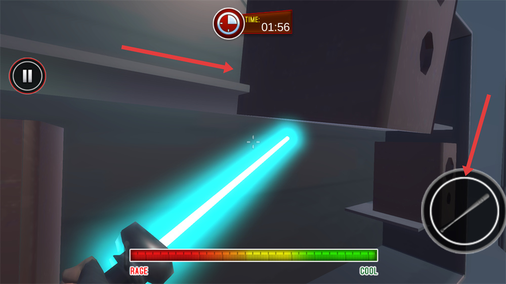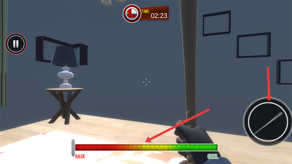3、進(jìn)入所選場景后,能看到畫面下方有怒氣值和冷靜值的進(jìn)度條,此時(shí)可以手持工具,通過點(diǎn)擊或滑動(dòng)屏幕等操作,對場景內(nèi)的物品進(jìn)行破壞。