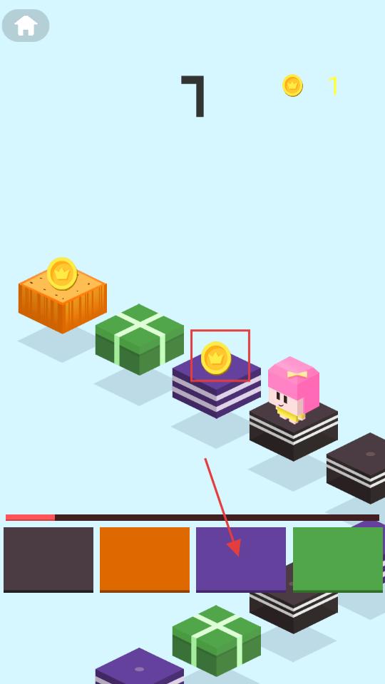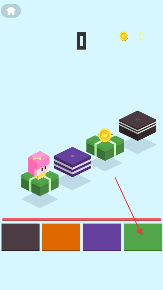 3、進入游戲后觀察角色下方方塊的顏色,點擊下方對應(yīng)顏色的方塊,讓角色跳躍到同色方塊上,同時可收集帶有金幣的方塊,積累金幣數(shù)量。