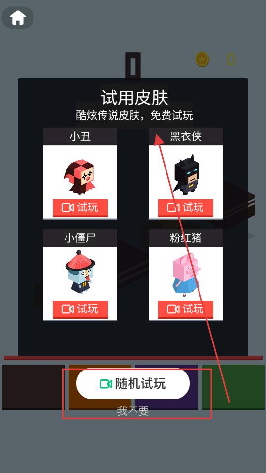 2、在皮膚試用界面若想體驗特定皮膚,點擊對應(yīng)皮膚的試玩按鈕,若不想試用,可選擇我不要,進入游戲的方塊跳躍場景。