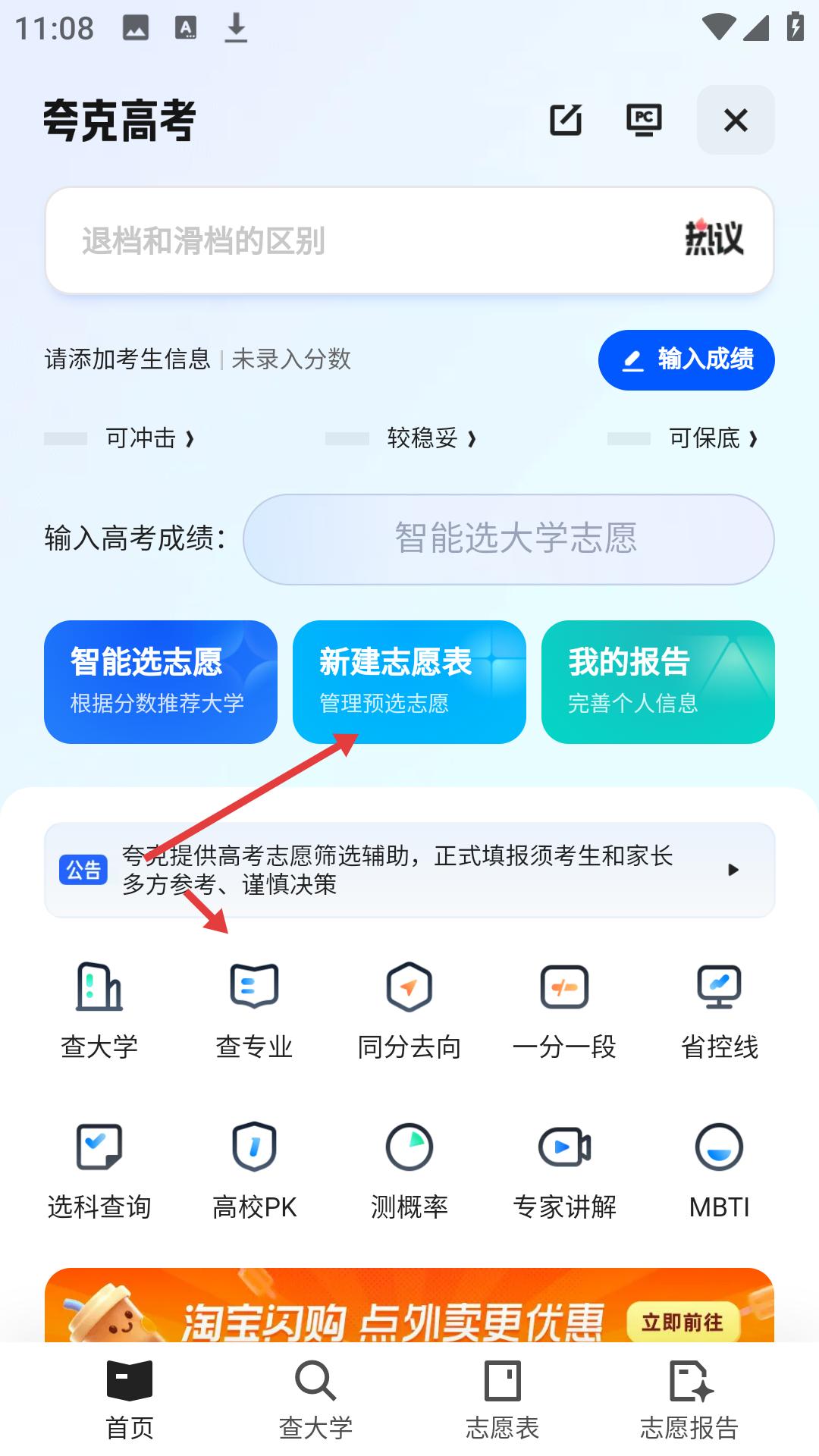1、打開夸克APP,點擊夸克高考,進入后可選擇智能選志愿,新建志愿表等功能,也能查詢大學、專業(yè)等信息,助力高考志愿填報。
