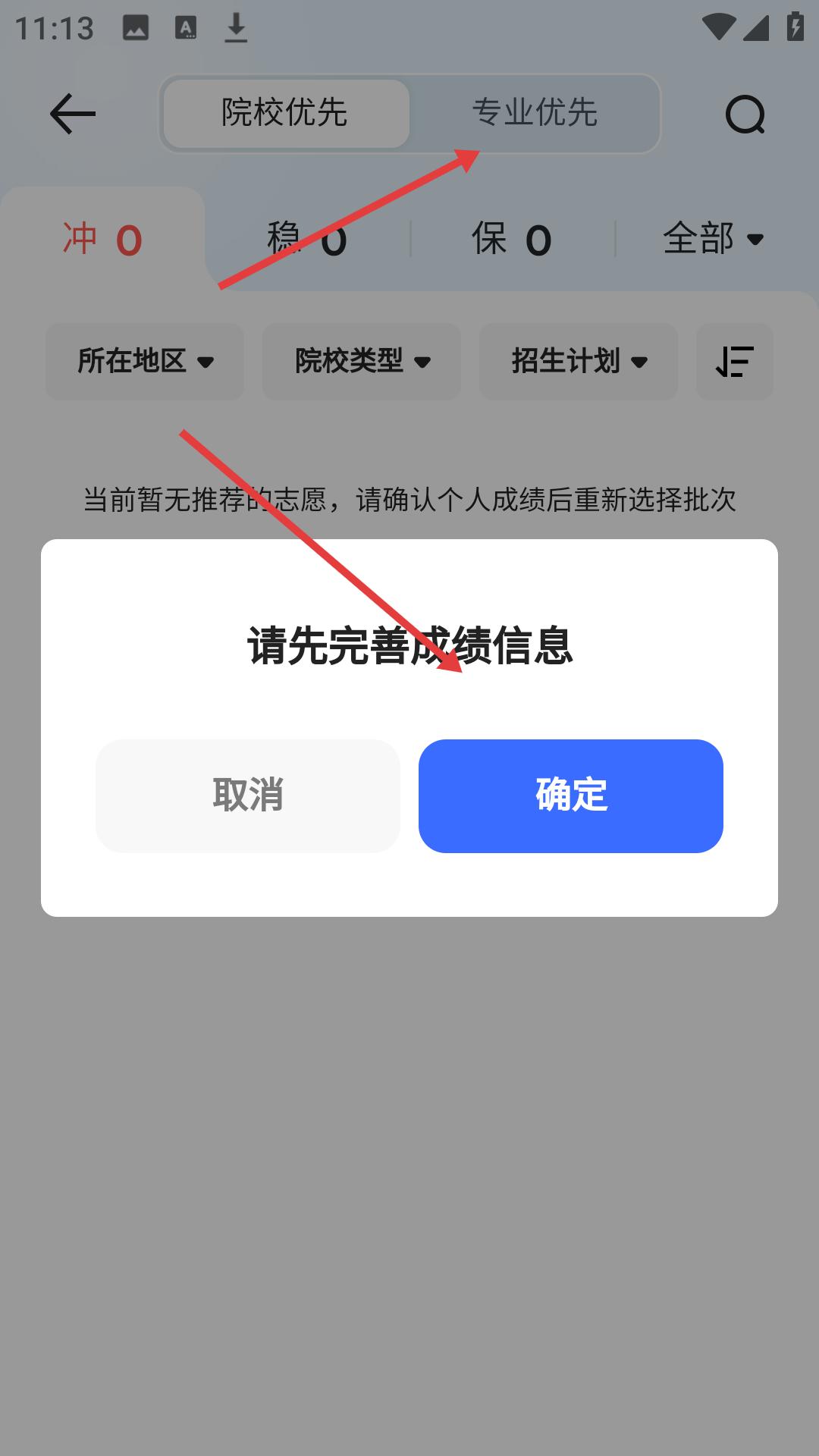 2、在夸克高考頁面,若想按專業(yè)優(yōu)先選志愿,需先完善成績信息,點擊確定按鈕去輸入成績,才能獲取相關志愿推薦。