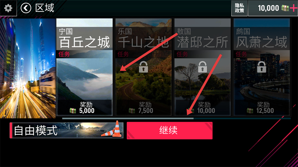 2、在區(qū)域選擇界面,挑選一個(gè)想要挑戰(zhàn)的區(qū)域,比如百丘之城,然后點(diǎn)擊繼續(xù)按鈕,進(jìn)入該區(qū)域的任務(wù)界面。