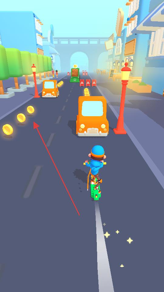 2、前進過程中觀察道路兩側(cè)與中間的金幣,調(diào)整滑板路線,盡量收集這些金幣,同時注意躲避車輛等動態(tài)障礙,確?;逍羞M的流暢性。
