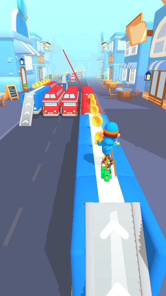 3、遇到車輛密集或有特殊通道的區(qū)域時,操控角色沿著通道繼續(xù)前進,收集通道上的金幣。