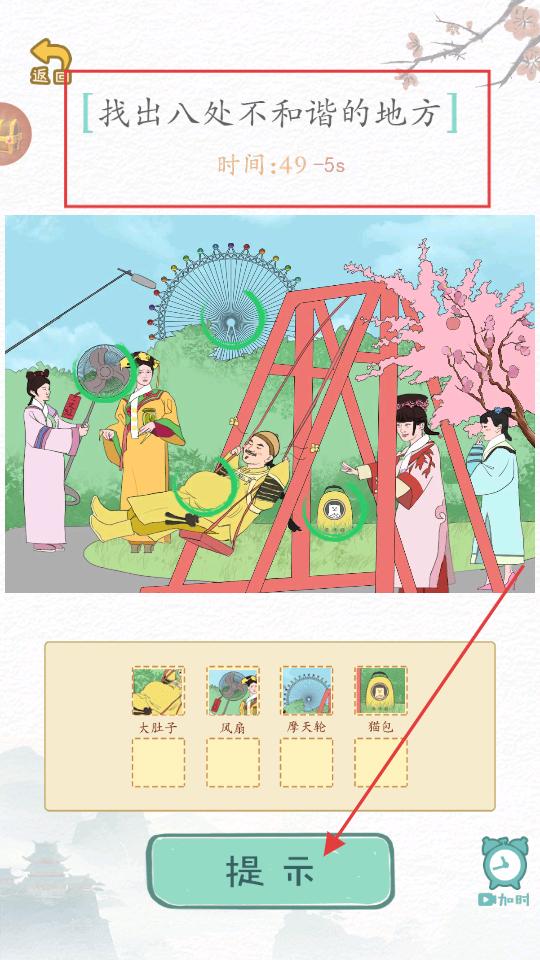 3、進入找不同場景后根據(jù)上方找出八處不和諧的地方的提示,仔細觀察畫面中的元素,若無法找到,可點擊下方的提示按鈕獲取線索,逐步找出不和諧之處。