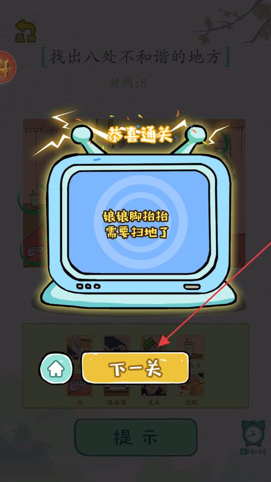 4、當成功找出所有不和諧的地方后,游戲會顯示恭喜通關界面,此時點擊下一關按鈕,就能進入下一個關卡,繼續(xù)進行找不同的挑戰(zhàn)。