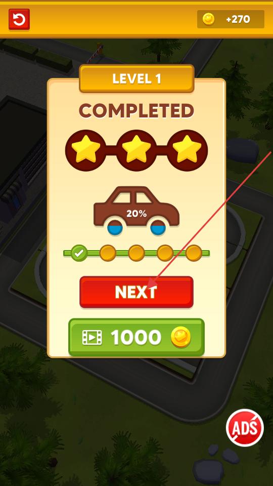 3、當車輛成功行駛到關卡1的終點后,游戲會顯示關卡完成界面,此時點擊紅色的NEXT按鈕,即可獲得金幣獎勵并進入關卡2,繼續(xù)進行道路拼接的挑戰(zhàn)。