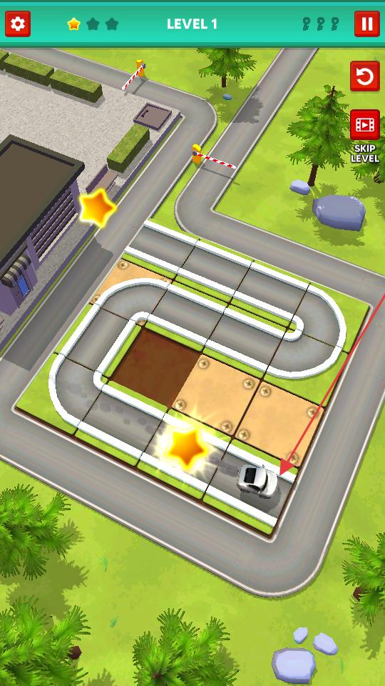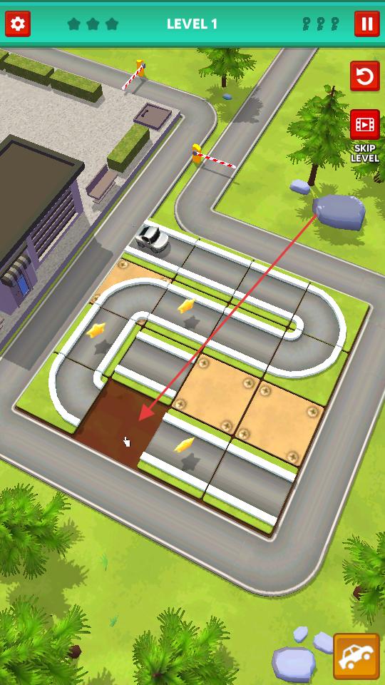 1、進入關卡1后觀察道路布局,將缺失的道路板塊移動到對應位置,使道路形成完整的通行路線,此時車輛可在拼接好的道路上開始行駛收集道具。