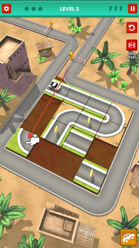 4、進入關卡2后觀察新的道路場景,按照提示將彎曲的道路板塊移動到合適位置,拼接出可供車輛通行的路線,讓車輛能再次出發(fā),收集道具推進關卡進程。