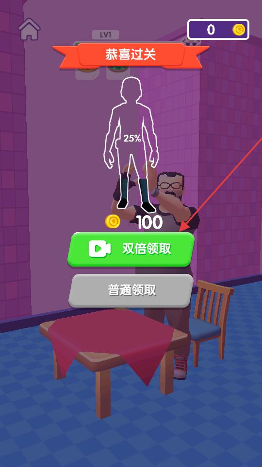 4、當(dāng)角色成功到達(dá)關(guān)卡終點后,游戲顯示恭喜過關(guān)界面,此時可選擇觀看視頻雙倍領(lǐng)取金幣,或直接點擊普通領(lǐng)取,拿到金幣獎勵后能繼續(xù)后續(xù)關(guān)卡。