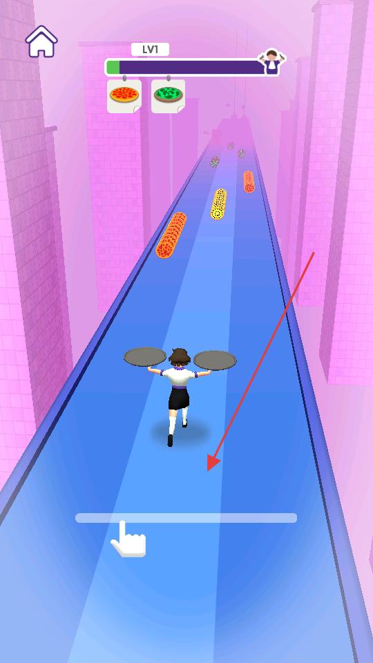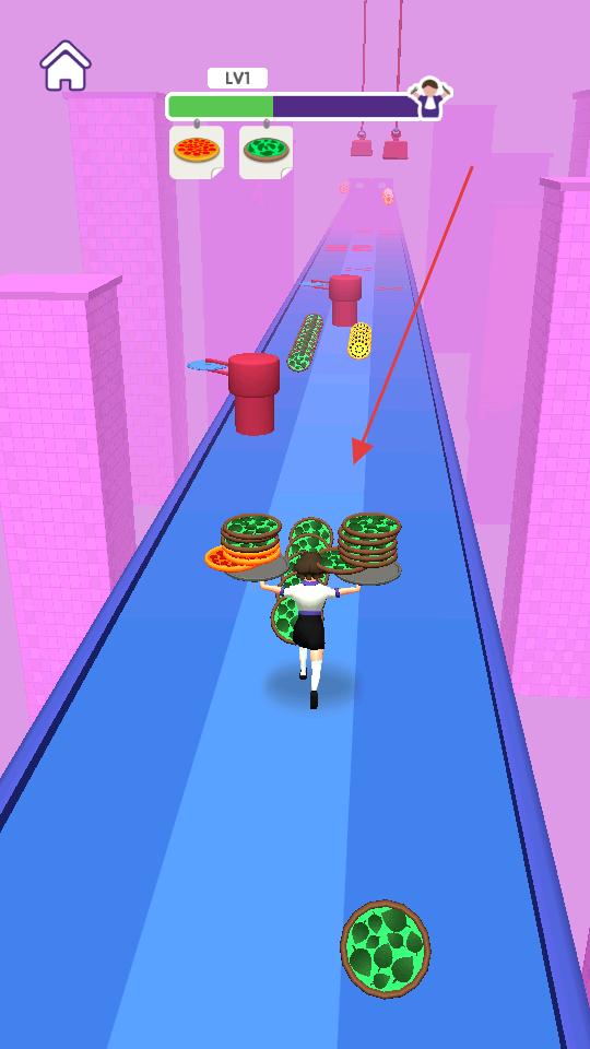 2、在跑道上通過滑動屏幕控制角色左右移動,收集道路上的披薩,讓角色手中的披薩數(shù)量慢慢變多。