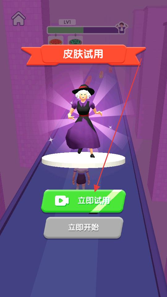 1、進(jìn)入游戲界面可選擇立即試用皮膚或直接點擊立即開始,進(jìn)入關(guān)卡1角色會在跑道上開始奔跑,準(zhǔn)備收集披薩等物品。