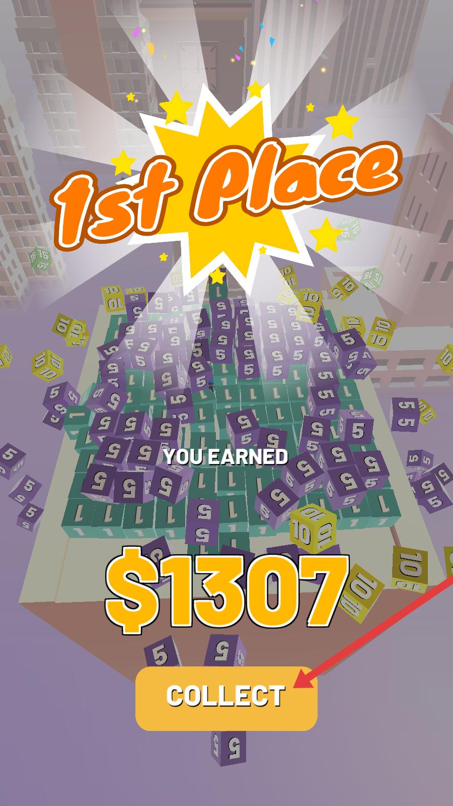 4、獲得第一名后,點擊收集按鈕,領(lǐng)取1307獎勵,為后續(xù)關(guān)卡升級或解鎖內(nèi)容提供資金。