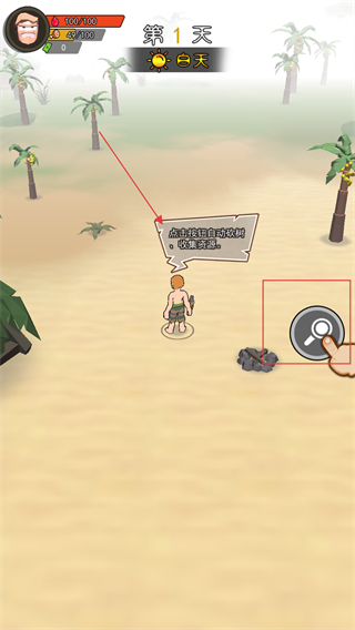 2、玩家點(diǎn)擊屏幕右下角的控制按鈕,操控角色移動到資源點(diǎn),點(diǎn)擊資源點(diǎn)讓角色自動收集資源。