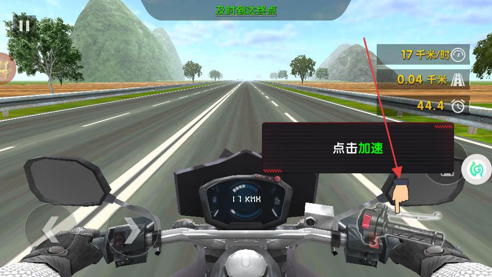 1、進(jìn)入狂飆摩托王者游戲,看到點(diǎn)擊加速的提示,點(diǎn)擊右側(cè)加速區(qū)域,摩托車速度提升,同時(shí)留意速度表和剩余距離,開始在公路上競(jìng)速行駛。