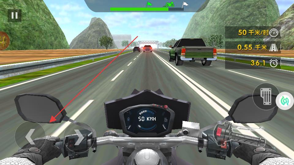 2、加速后摩托車速度加快,前方出現(xiàn)車輛時(shí),點(diǎn)擊左側(cè)方向按鈕,操控摩托車向左變道,順利躲避車輛,繼續(xù)朝著終點(diǎn)方向前進(jìn)。