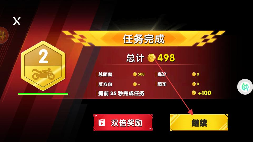 3、成功到達(dá)終點(diǎn)后進(jìn)入任務(wù)完成界面,能看到總計(jì)獲得的金幣以及任務(wù)完成的各項(xiàng)情況,點(diǎn)擊繼續(xù)按鈕,進(jìn)入下一個(gè)游戲環(huán)節(jié)。