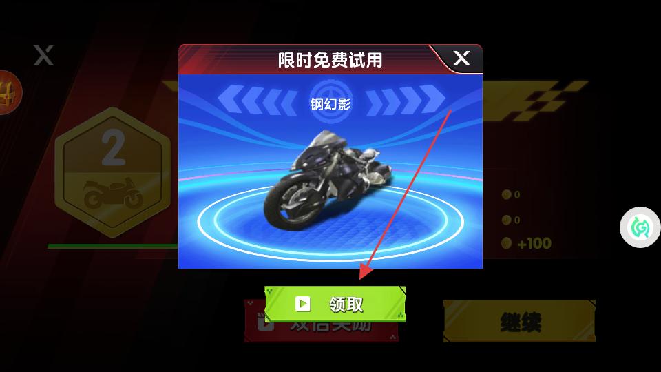 4、在后續(xù)界面中若彈出限時(shí)免費(fèi)試用摩托車的提示,點(diǎn)擊領(lǐng)取按鈕,獲取該款摩托車的試用權(quán)限,方便在后續(xù)的競(jìng)速挑戰(zhàn)中使用。