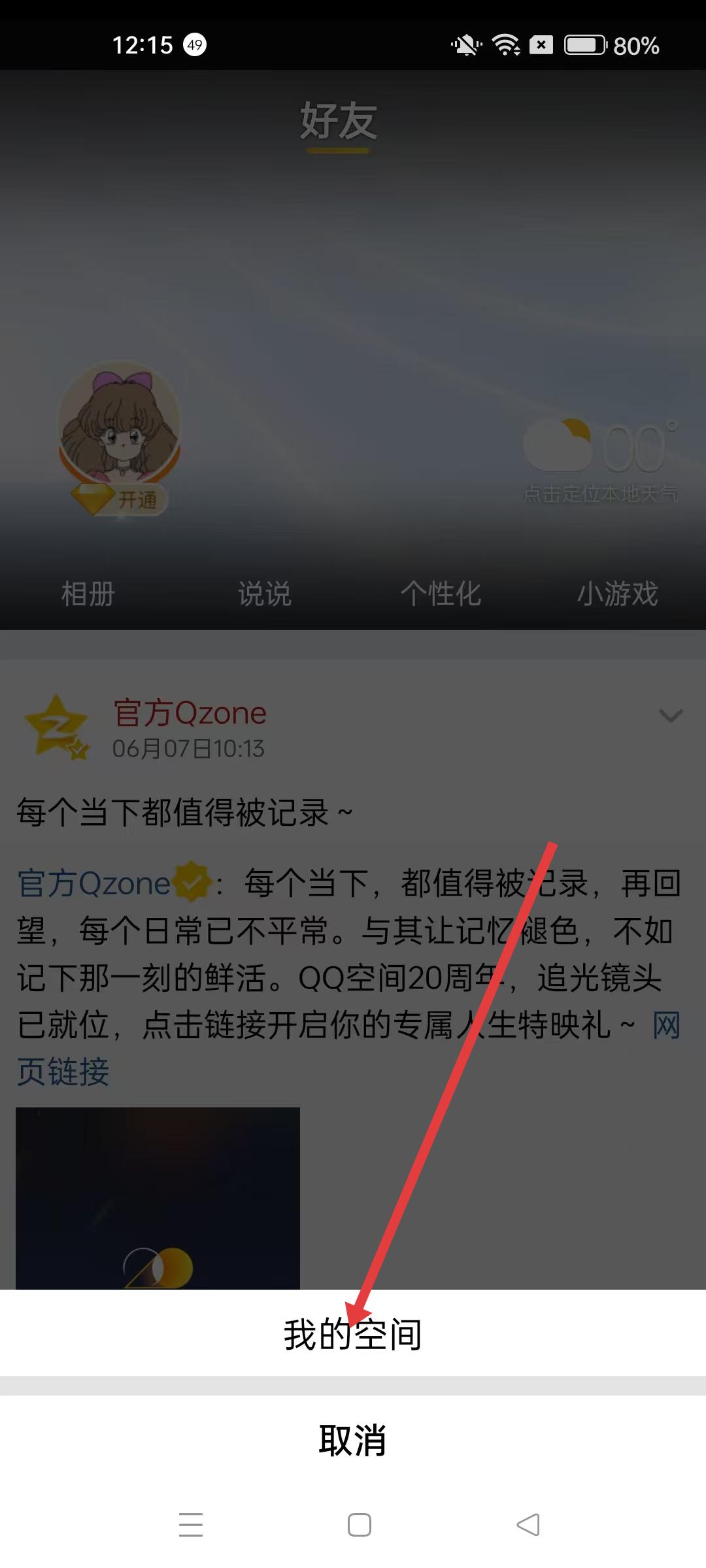 4、彈出的操作選項(xiàng)中,點(diǎn)擊我的空間選項(xiàng),即可進(jìn)入個(gè)人空間,個(gè)人空間中,可查看自己發(fā)布的動(dòng)態(tài)、相冊(cè)、說(shuō)說(shuō),還能進(jìn)行個(gè)性化設(shè)置。